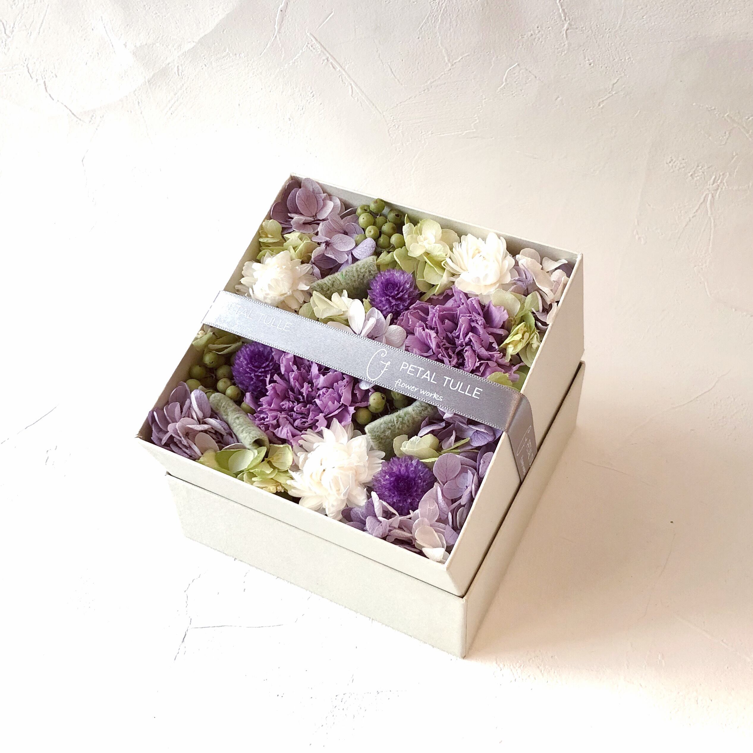 全てプリザーブドフラワーでお作りしております。スタイリッシュなパープル×グリーン。